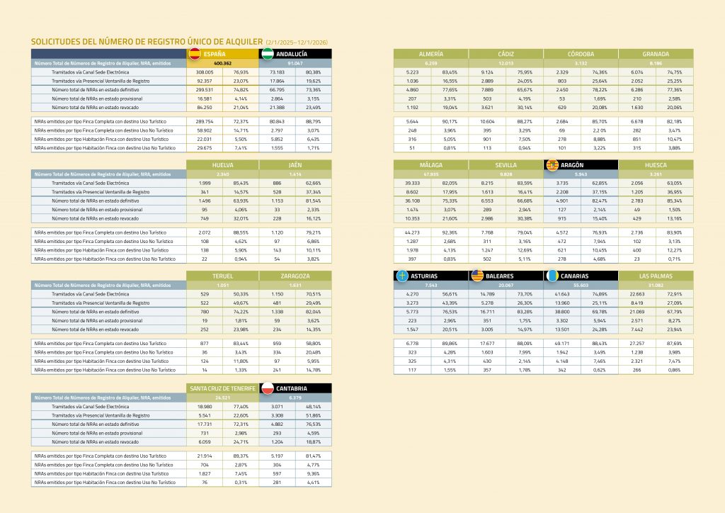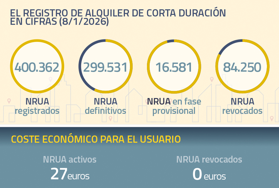 Los últimos datos a fecha de 8 de enero de 2025 del sistema del Número de Registro Único de Alquiler (NRUA), confirman su continuo crecimiento y consolidación. En total, se han emitido 400.362 registros, de los cuales 299.531 son definitivos, 16.581 se encuentran en fase provisional y 84.250 han sido revocados. Del total de NRUA emitidos, 289.754 corresponden a Finca Completa Turístico, 58.902 a Finca Completa No Turístico, 22.031 a Habitación Finca Turístico y 29.675 a Habitación Finca No Turístico.