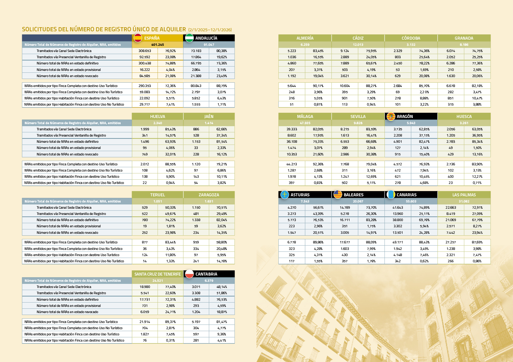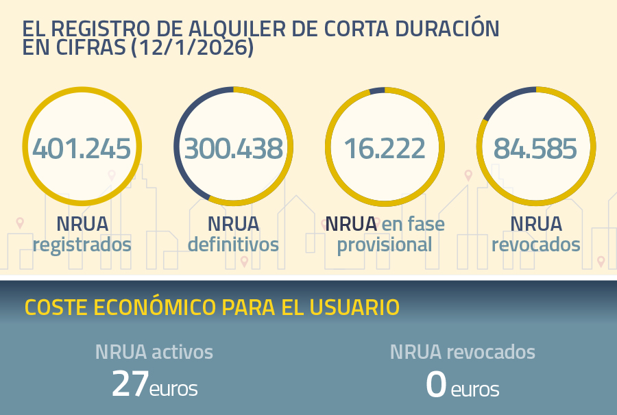Los últimos datos a fecha de 12 de enero de 2025 del sistema del Número de Registro Único de Alquiler (NRUA), confirman su continuo crecimiento y consolidación. En total, se han emitido 401.245 registros, de los cuales 300.438 son definitivos, 16.222 se encuentran en fase provisional y 84.585 han sido revocados. Del total de NRUA emitidos, 290.353 corresponden a Finca Completa Turístico, 59.083 a Finca Completa No Turístico, 22.092 a Habitación Finca Turístico y 29.717 a Habitación Finca No Turístico.