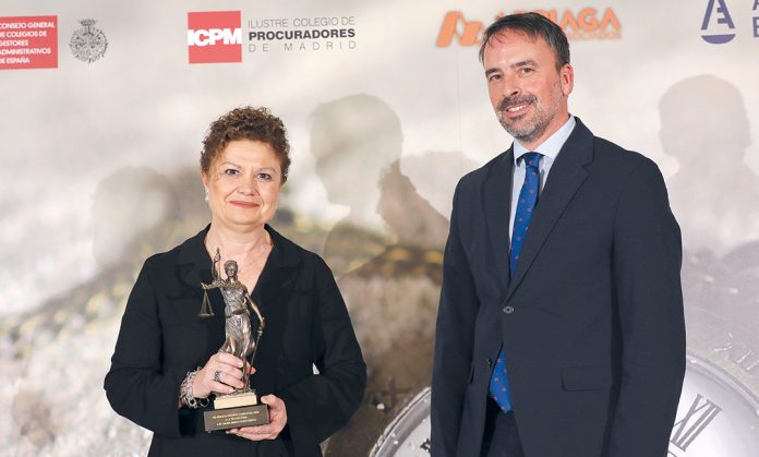La anterior decana del Colegio de Registradores, María Emilia Adán, fue reconocida con el premio Confilegal 2025 en la categoría Trayectoria, que recibió de manos del secretario de Estado de Justicia, Manuel Olmedo.